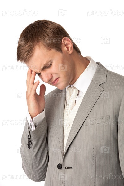 Молодой человек в костюме страдает от головной боли