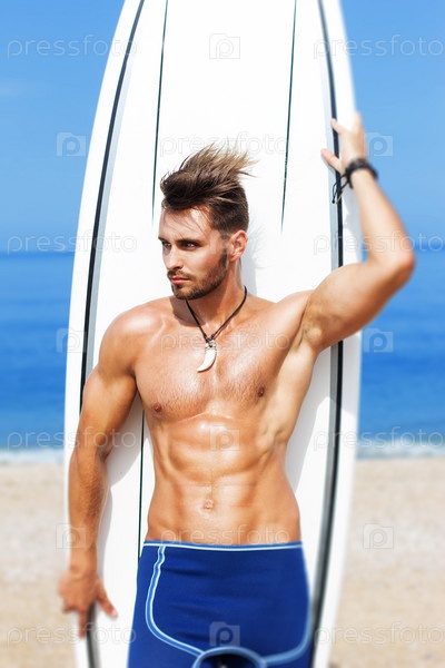 Молодой мужчина на пляже с доской для серфинга