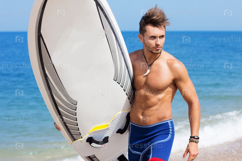 Молодой мужчина на пляже с доской для серфинга