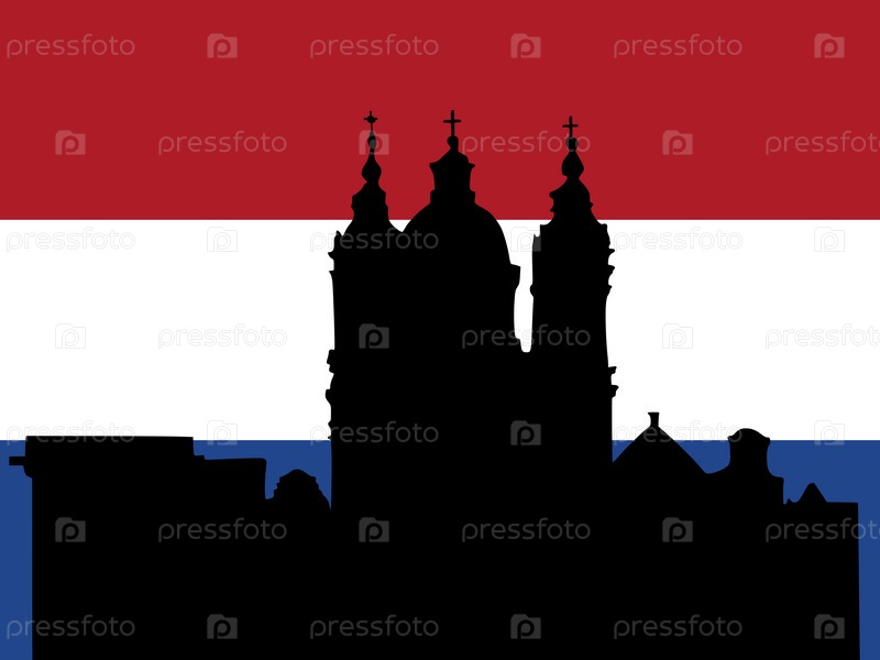 Силуэт Амстердама на фоне голландского флага