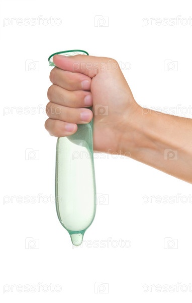Зеленый презервативов с водой в руке, изолированные на белом фоне