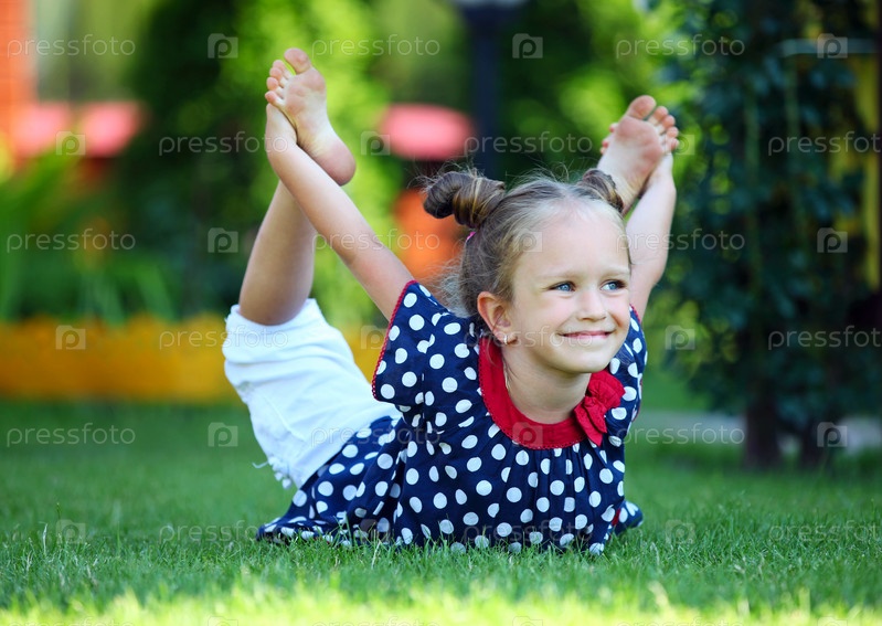 Симпатичная четырехлетняя девочка делает зарядку на свежем воздухе