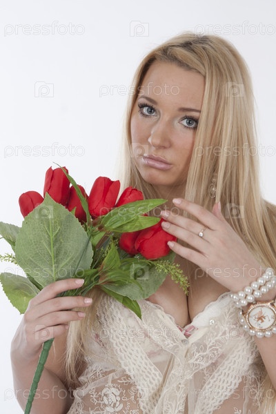 Красивая девушка с букетом тюльпанов