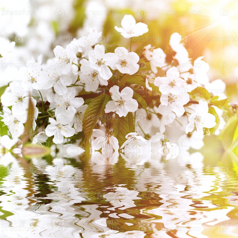 Красивые белые цветки с отражением в воде