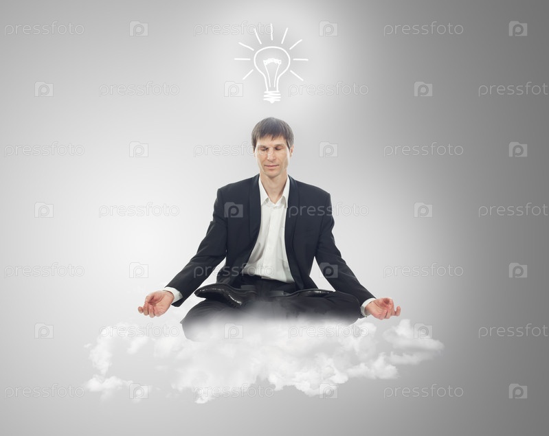 Бизнесмен сидит в позе лотоса на облаке с лампочкой над головой