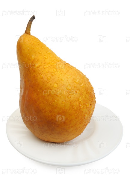 Груша на белой тарелке на белом фоне
