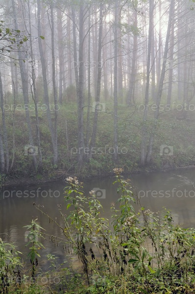Осенний туман над рекой ранним утром. Национальный парк в Литве
