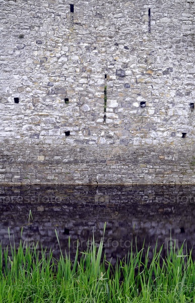 Стена Тримского замка и ров. Средневековый королевский замок в Триме в графстве Мит, Ирландия, весенним ранним утром