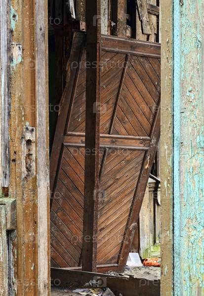 Старый сломанный вход в дом. Девевянный столб и дверь