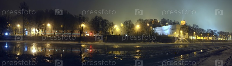 Панорама Вильнюса в ночное время. Городские огни отражаются в реке