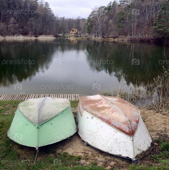 Две лодки на берегу озера весной. озерный край в Вильнюсском районе