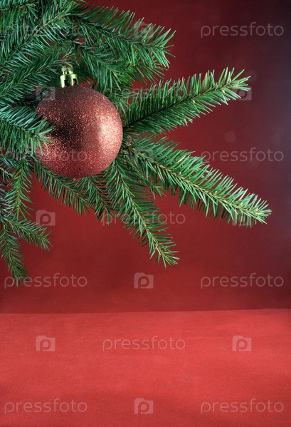 Красный новогодний шар на еловой ветке. Рождественская открытка