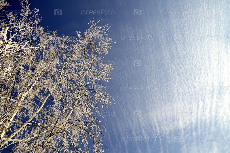 Занндевелая береза на фоне ярко-синего неба в морозный зимний день