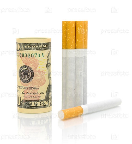 Дорогие привычки. 10 долларов и сигареты на белом фоне с отражением