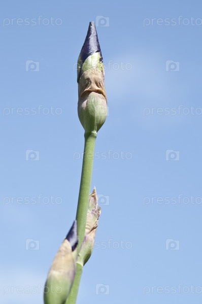 Ветка ириса с бутонами на фоне синего неба