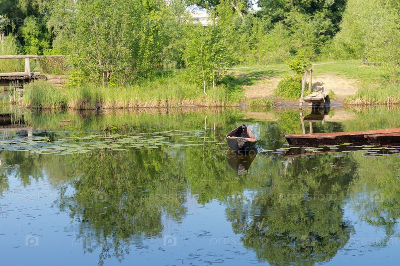 Весенний пейзаж - деревянные лодки на озере