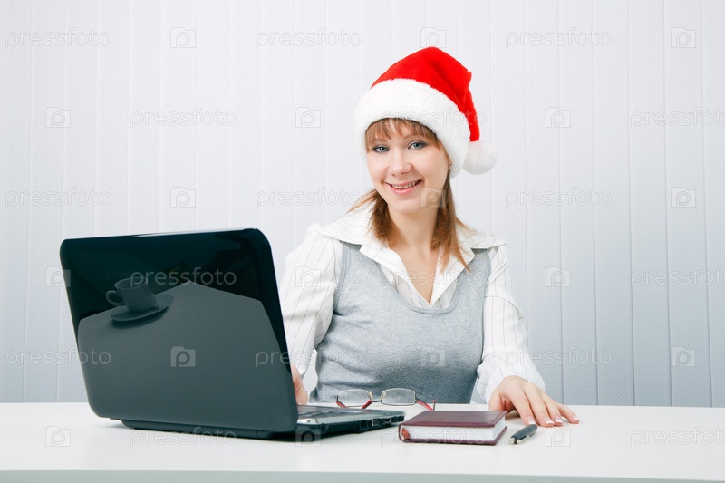 Бизнес-леди в колпаке Санты в офисе