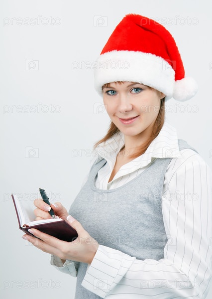 Бизнес-леди в колпаке Санты в офисе