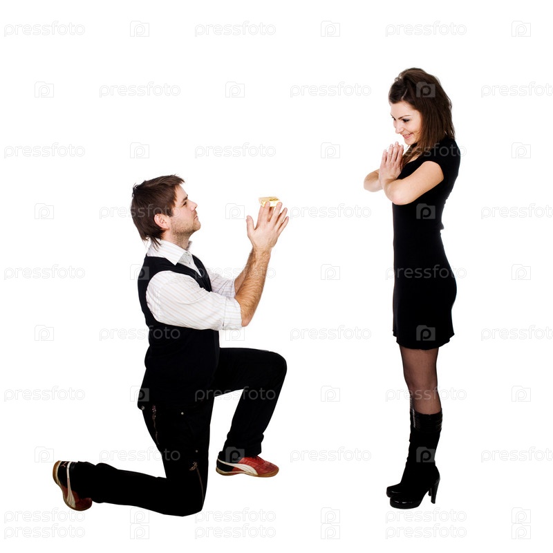 Удивленная женщина и мужчина, стоящий на коленях