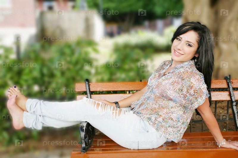 Портрет улыбающейся девушки, сидящей на набережной в парке