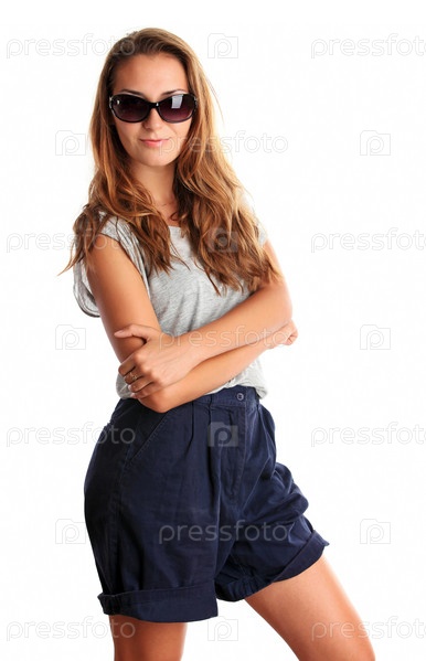Великолепная девушка в солнцезащитных очках на белом фоне