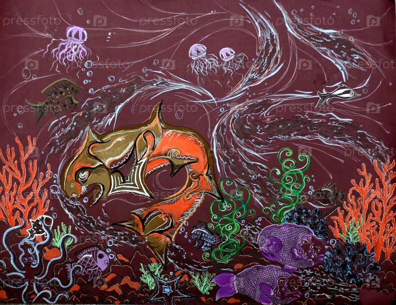 Подводный мир, детский рисунок; гуашь, гелевые ручки