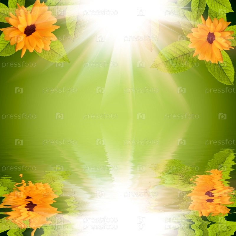 Естественный зеленый фон с цветами и солнцем