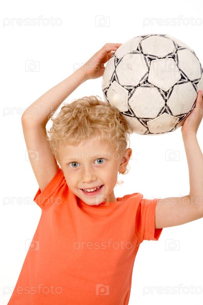 Кудрявый мальчик с футбольным мячом на белом фоне