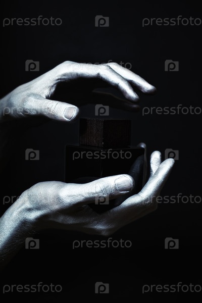 Мужские руки в серебряной краске держат бутылку крупным планом