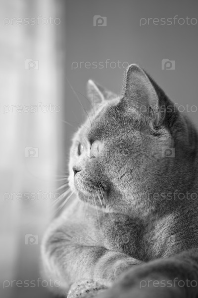 Британский серый кот лежит у окна