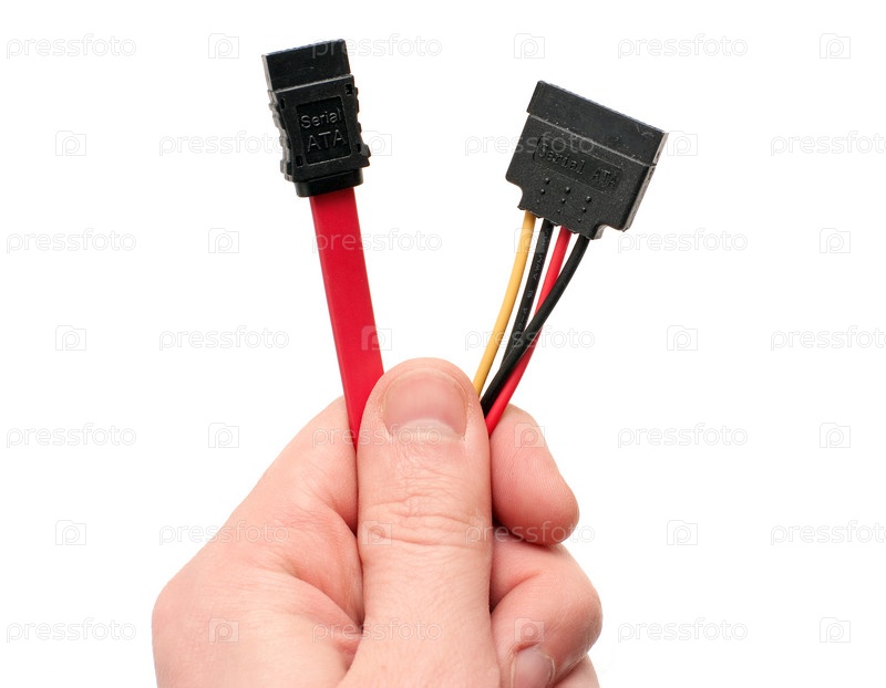 Интерфейс и силовые кабели в руке, на белом