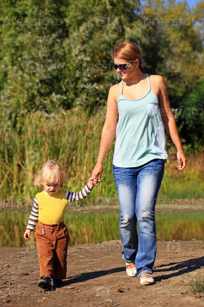 Молодая женщина и двухлетний мальчик гуляют в солнечный день