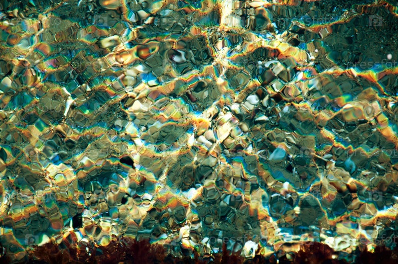 камни, ракушки, водоросли и песок на морском дне сквозь рябь на воде в солнечном свете