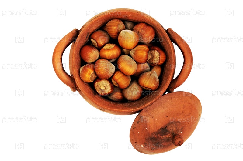 Горшок с фундуком крупным планом, изолированный на белом фоне