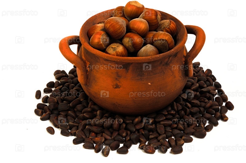 Горшок с фундукоми кедровыми орехами крупным планом, изолированный на белом фоне