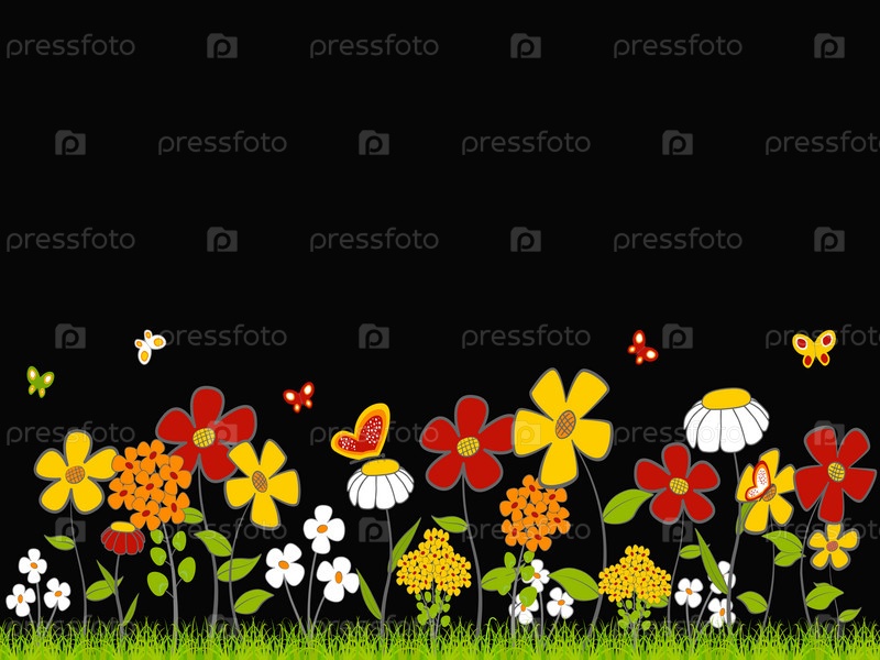 Цветочный мультипликационный фон на черном с пространством для текста