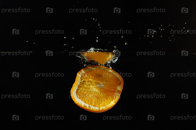 Нарезанный спелый апельсин падает в воду со всплеском на черном фоне крупным планом