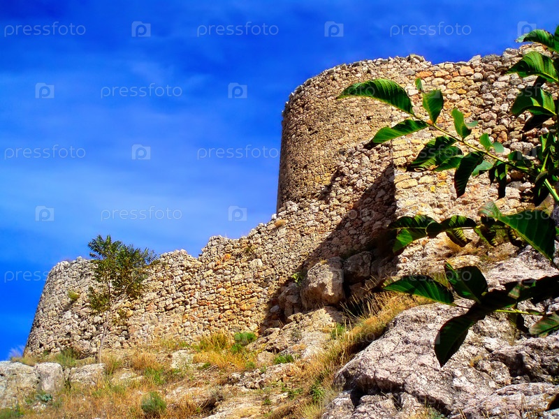 Древняя генуэзская крепость в Крыму на фоне голубого неба