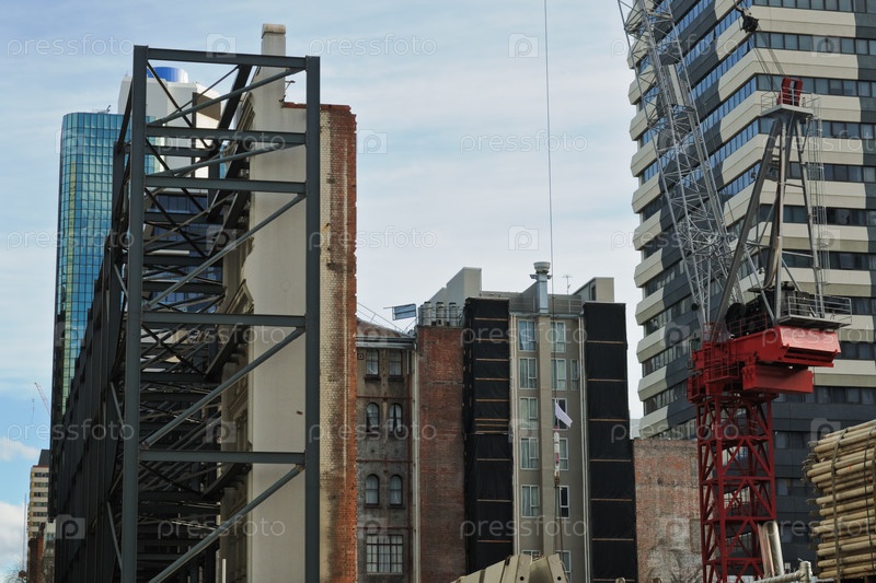 Стены старого здания, поддерживаемые металлической конструкцией, современное здание и кране на строительной площадке в Мельбурне, Австралия