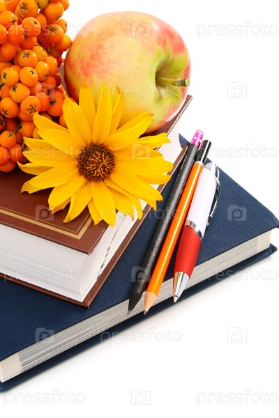 Книги, карандаши, яблоко и рябина на белом фоне