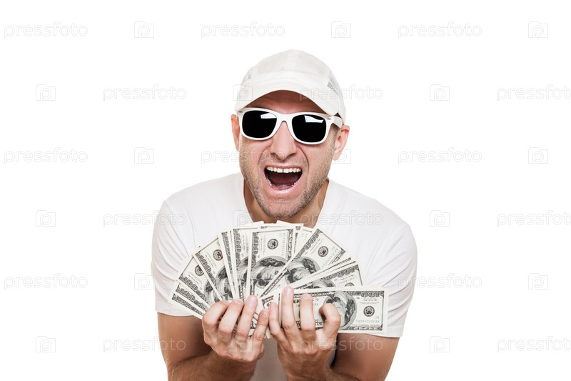 Радостный молодой мужчина в темных очках и бейсболке с долларами в руках