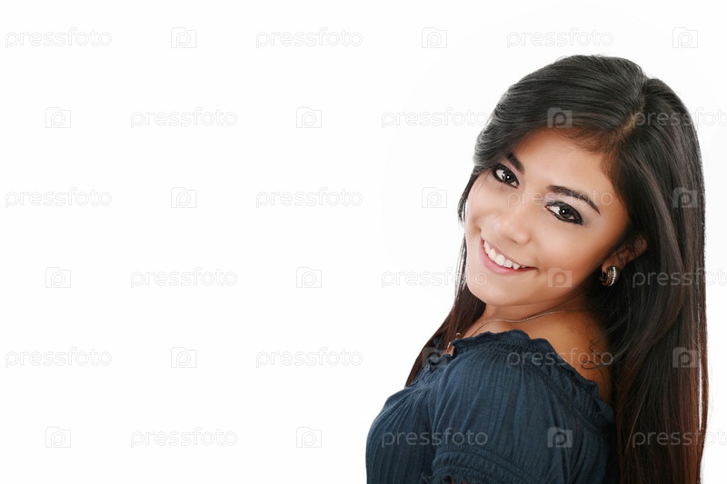 Портрет привлекательной улыбающейся европейской брюнетки, изолированный на белом