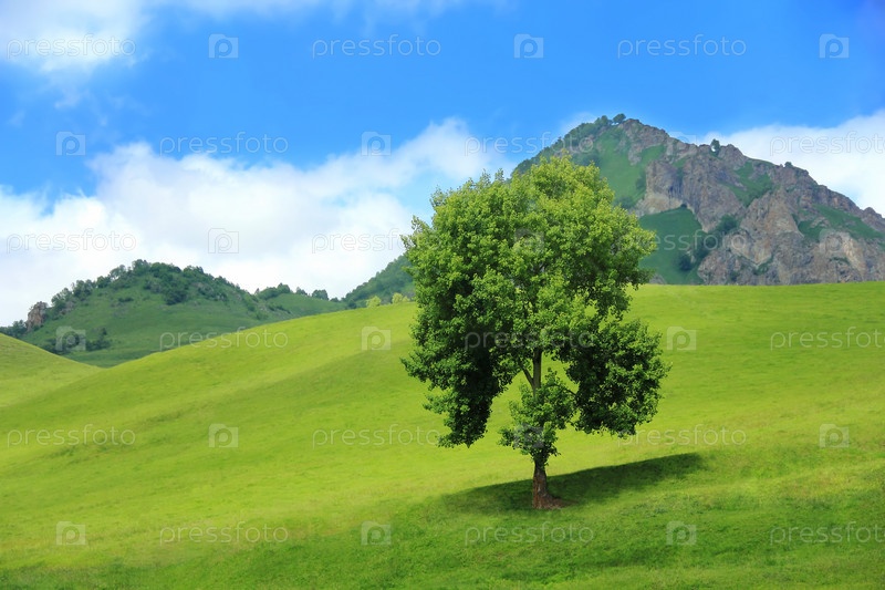 Зеленое дерево на поле на фоне гор