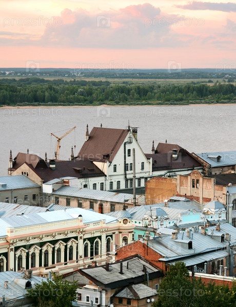 Розовый закат над старой частью Нижнего Новгорода, Россия