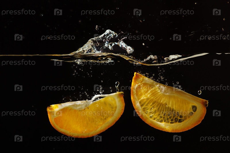 Апельсин в воде на черном фоне