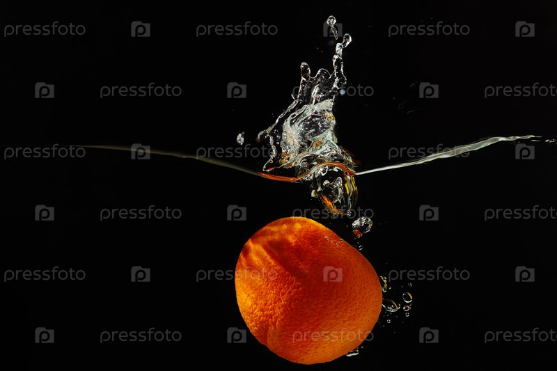 Апельсин в воде на черном фоне
