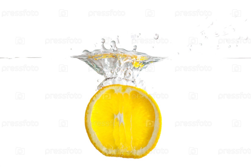 Нарезанный спелый лимон падает в воду со всплеском на белом фоне крупным планом