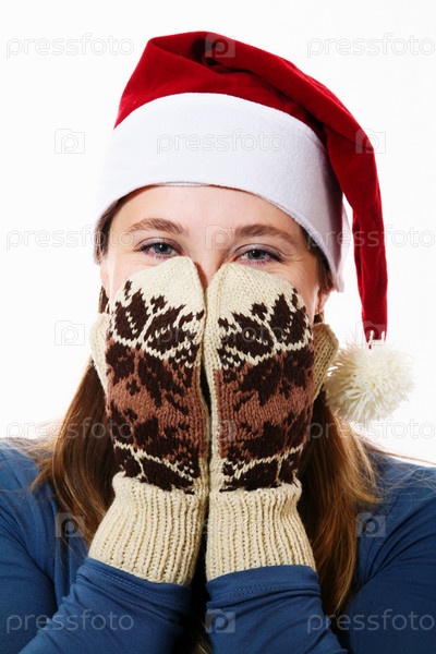Симпатичная девушка в колпаке Санты и варежках
