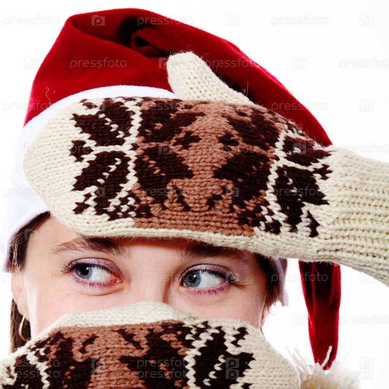 Симпатичная девушка в колпаке Санты и варежках