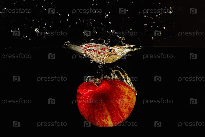 Половинка свежего яблока падает в воду со всплеском на черном фоне крупным планом